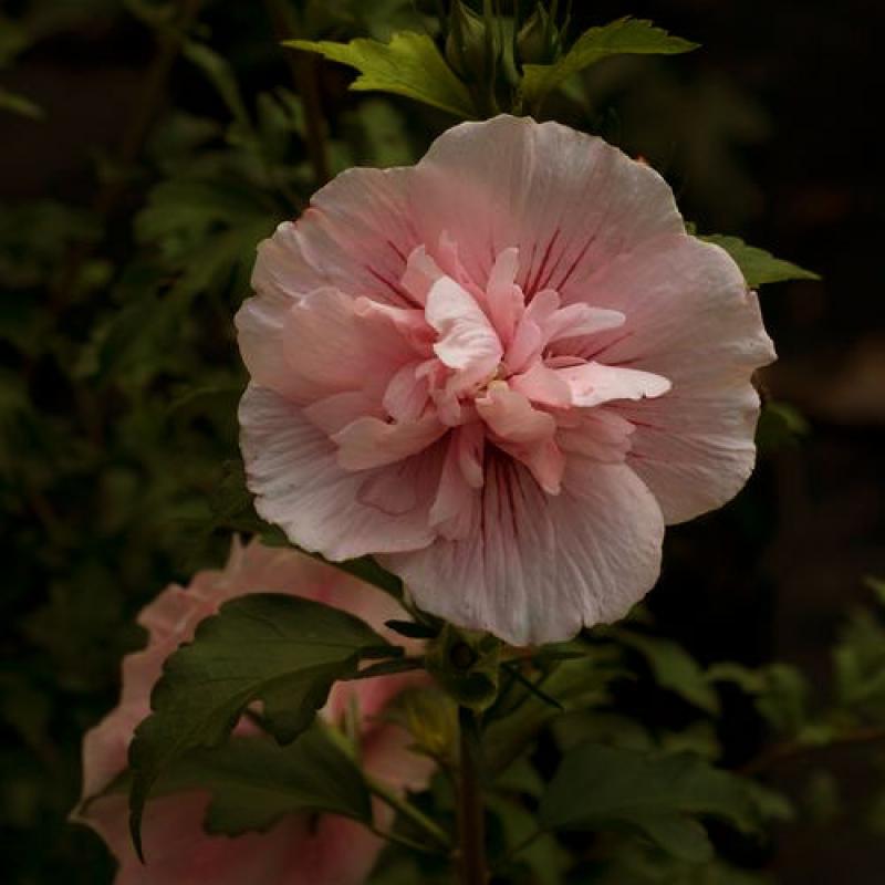 A vigorous grower which features deep emerald green foliage and large soft pink flowers with a frilly ruffled center and faint red stripes, 'Pink Chiffon' will bloom from late July to September.
