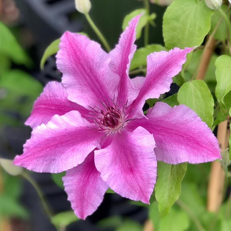 The compact bushy vines of 'Cherokee' feature 3-4" two-toned lightly ruffled flowers of dusky-pink with a deep magenta pink bar. It will bloom freely from spring to late summer. (Pruning Group 2)