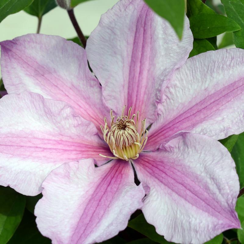 A compact vine, this variety's soft pink pointed petals are accentuated by a deeper pink bar and attractive red-brown contrasting anthers. 'Sally' will bloom heavily in late June and repeat through the late summer. (Pruning Group 3)