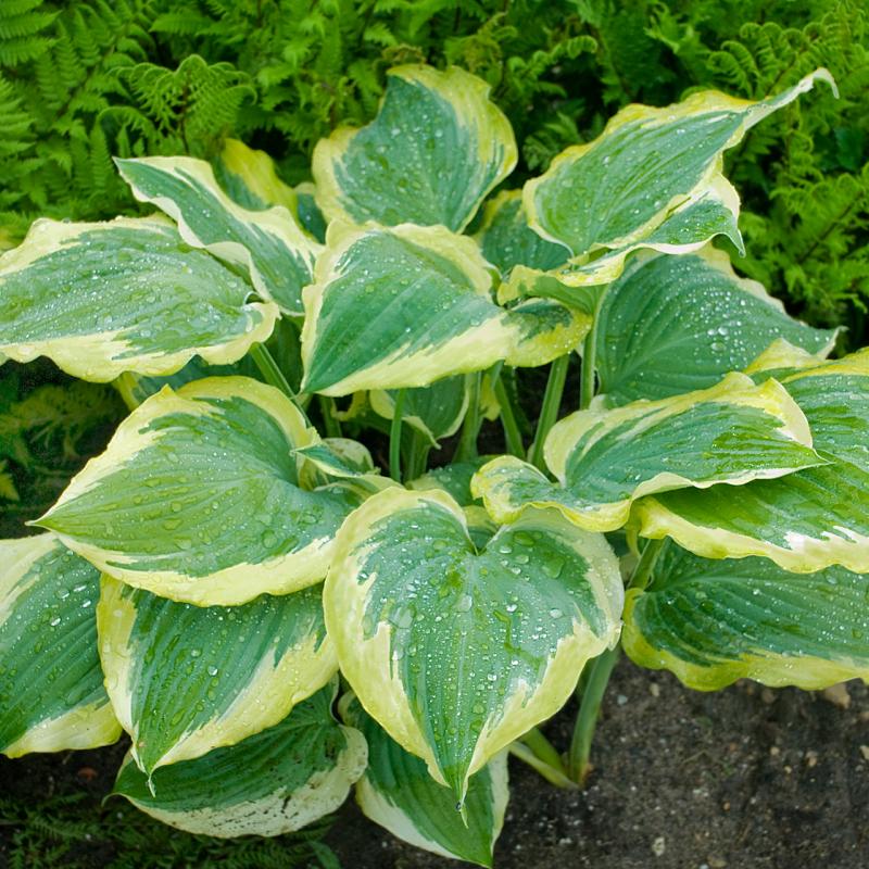 'Seducer' forms a large mound of dark green leaves with a chartreuse to gold margin and a trace of white between the center and margin. Summer heat draws out the unique coloration. Lavender-kissed white flowers appear in July.
