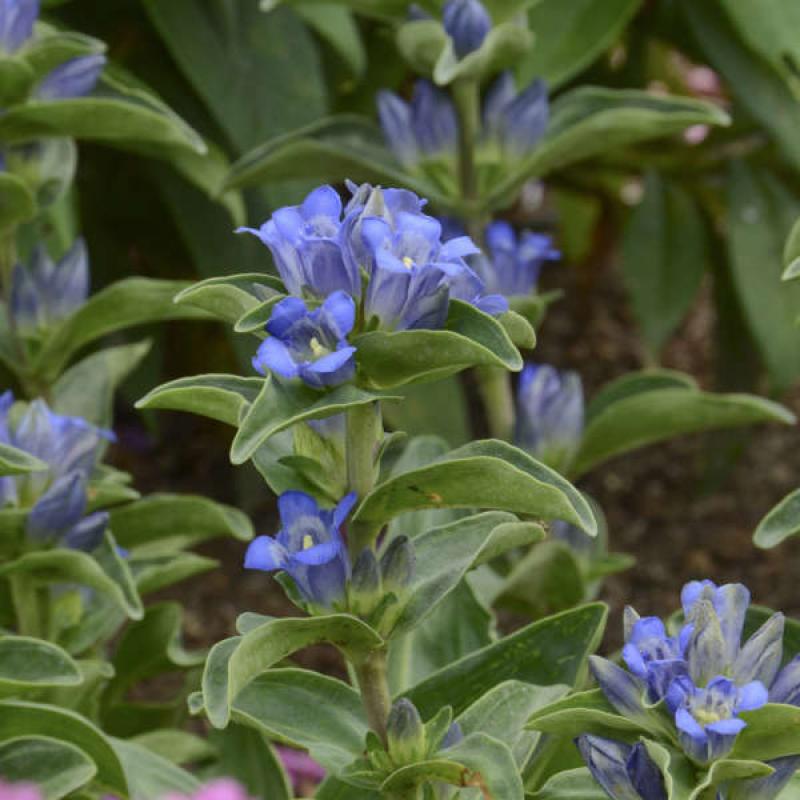 This unusual variety is one of the easiest Gentians to grow. It forms mounds of shiny emerald green foliage and upright stems from late July to September that bear violet-blue, four-petaled flowers with lighter centers where the leaves meet the stems.