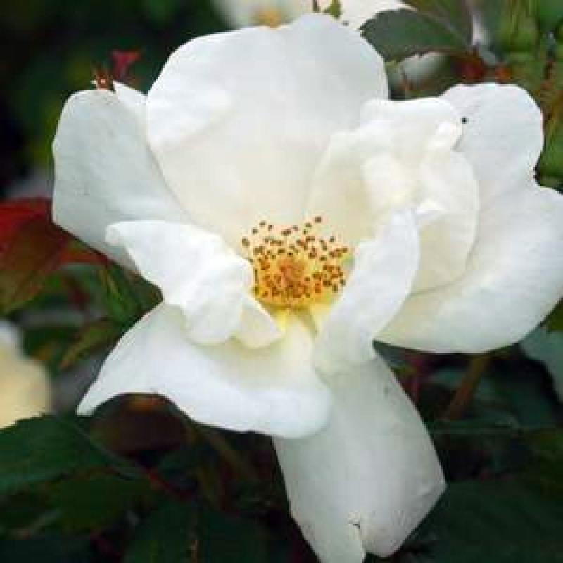 The single white flowers of 'White Knock Out' are produced from early June to September on a vigorous plant with deep green foliage.