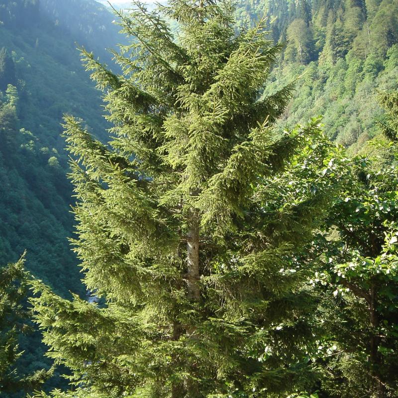 A graceful evergreen conifer native to the Caucasus and northeastern Turkey, prized for its dense, pyramidal form and dark green, glossy needles. Noted for having the shortest needles of any spruce, which give it a fine-textured, elegant appearance. Slow-growing and long-lived, it is highly valued as a specimen tree or for use in large landscapes.
