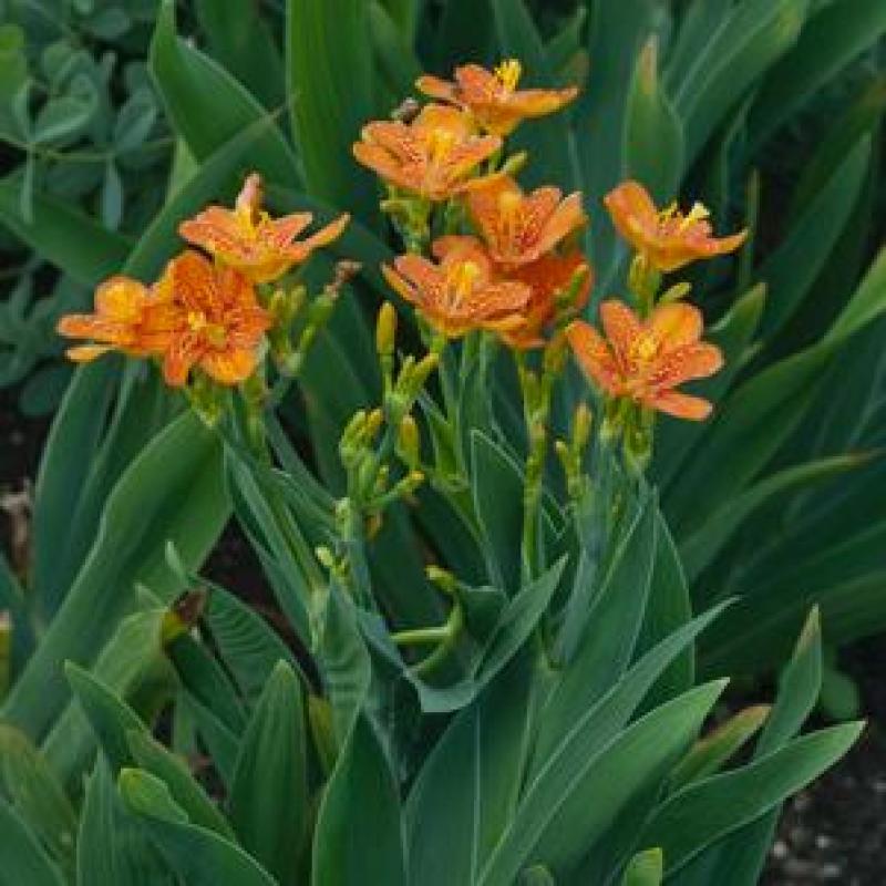 Two inch wide, brilliant orange blossoms with heavy red specking will top the attractive sword-shaped leaves of this selection. Clusters of black seeds resembling blackberries appear in late summer as a bonus.