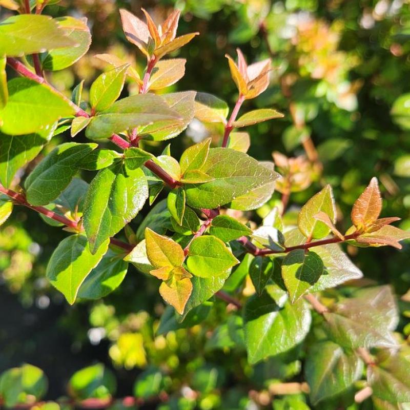 This compact, evergreen shrub features glossy green leaves that take on a bronze tint in cooler months, and it blooms profusely with small, fragrant white flowers that have a soft pink tint as they emerge.