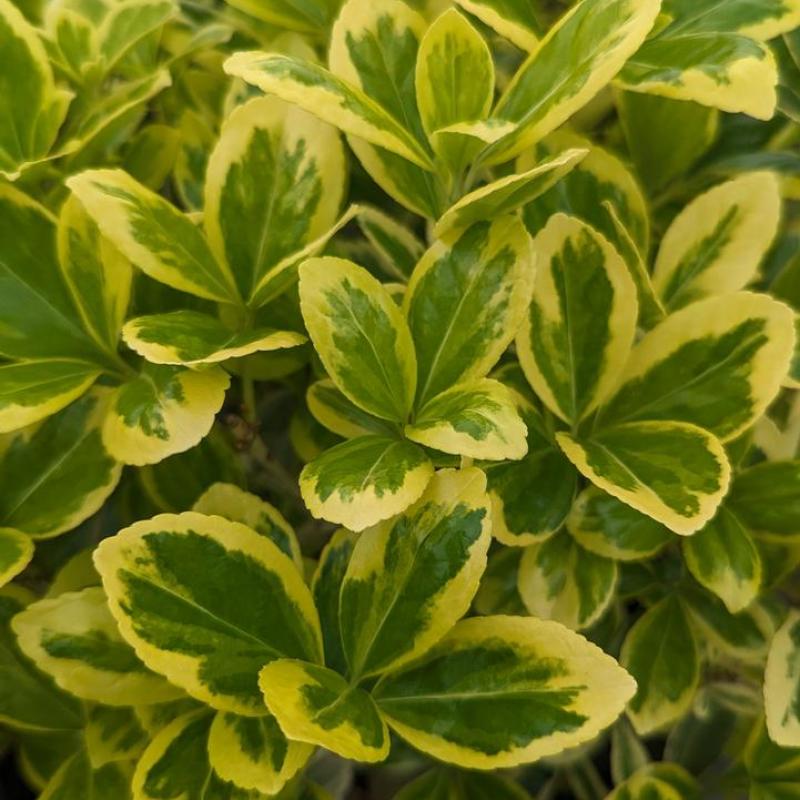 Rounded, metallic green leaves sport a creamy border that provides instant and year round color to the landscape. Aggressive growing, this selection is the perfect, easy to grow foliage color plant. Colorful foliage year round. Easy to grow and maintain. Perfect for foundation use or for grouping to form a colorful hedge.