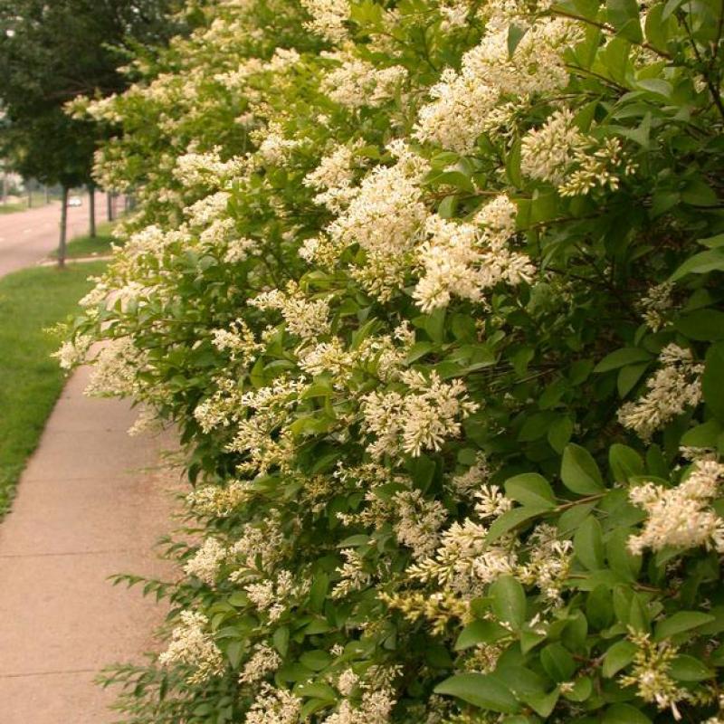 A densely branched deciduous shrub, Amur Privet features handsome green leaves that may be semi-evergreen in mild climates. Creamy white flowers are followed by black berries that ripen in fall and attract birds. Widely grown as a specimen plant, screen, or tall hedge. Tolerates a wide range of soils and urban conditions. Dislikes wet soils. Responds well to pruning.