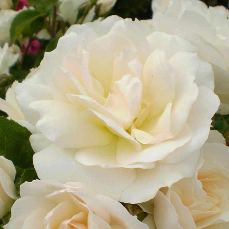 Showy, fully double, white flowers with peach overtones emerge from apricot tinted buds and are produced from late spring through fall on this upright, rounded plant with glossy, deep green, disease resistant foliage.
