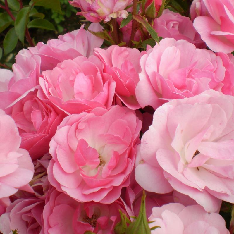'Pinktopia' is a heavily flowered, easy-care variety with clusters of semi-double, clear medium-pink flowers that almost obscure the disease resistant foliage from late June to September!