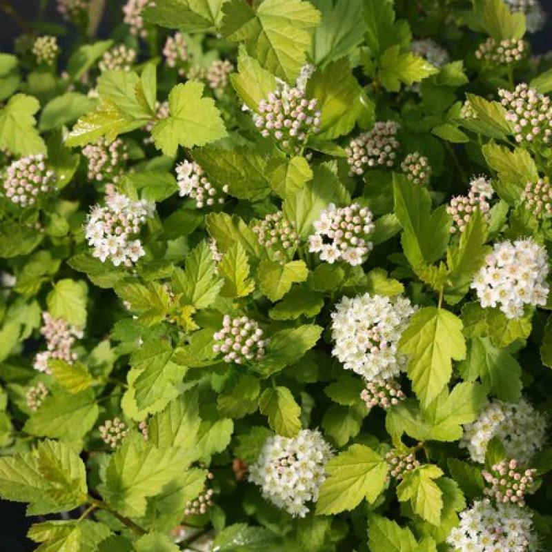 This compact plant features brilliant yellow new growth with small, refined foliage. Dozens of clusters of white-pink flowers will arrive in early June.