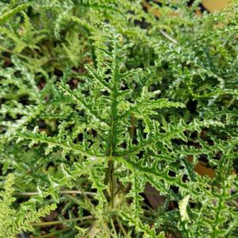 Incredibly lacey deep green pine scented foliage makes a lovely textural contrast. Plants are topped with small purple flowers with dark red centers.