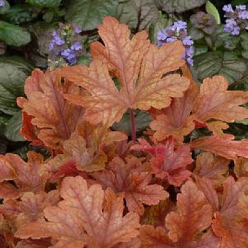 'Buttered Rum' features deeply cut, maple-leaf looking foliage that is a glossy orange-yellow from spring to summer. Small clusters of white bell-shaped flowers on wiry stalks will appear in June and cool weather will give a deep rose tone to the foliage.