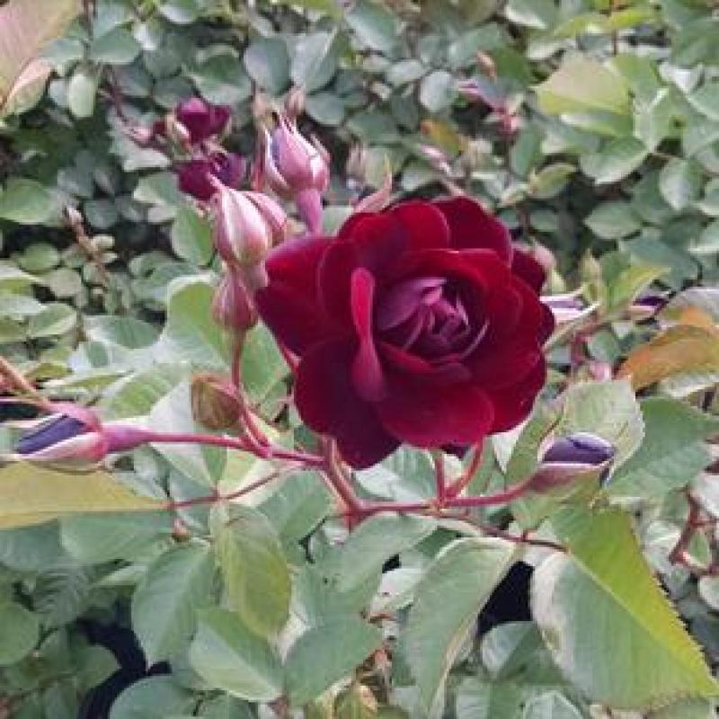 'Navy Lady' offers clusters of loosely double, lightly fragrant, deep blood-red flowers with a velvety look that come continuously from June to frost. This hardy, robust plant also has superior disease resistant foliage.