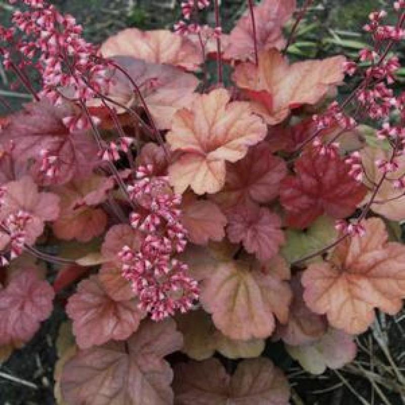 This variety's thick, maple-like, rich pink-apricot foliage deepens to burnt orange as the season matures and forms a pleasing, colorful tight mound. Flower stems will rise above the foliage and bear pink bell flowers through June.