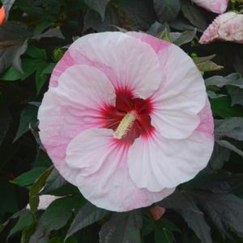 Sporting large 7-8" white flowers that are blushed with pink and accented by a deep red eye, this variety's deep near-black foliage will really show off the flowers. A compact plant, it will bloom from late summer to early fall.