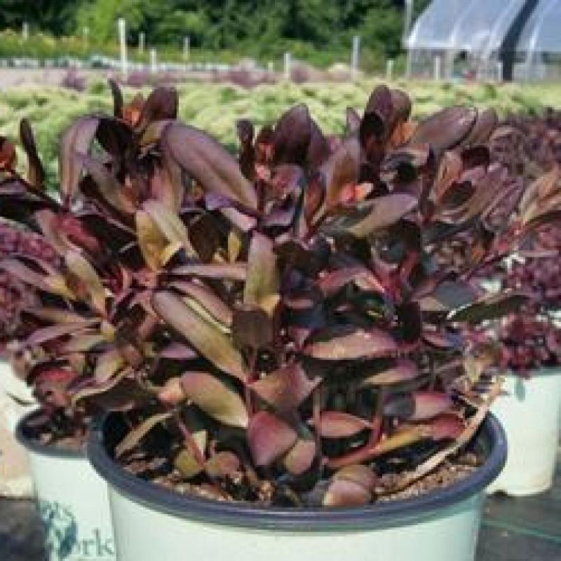 'Touchdown Teak' has amazing glossy red-brown to purple-brown leaves, red stems, and a vigorous, upright-but low habit. Rose-red flowers appear in the summer and will be highly attractive to bees and butterflies.