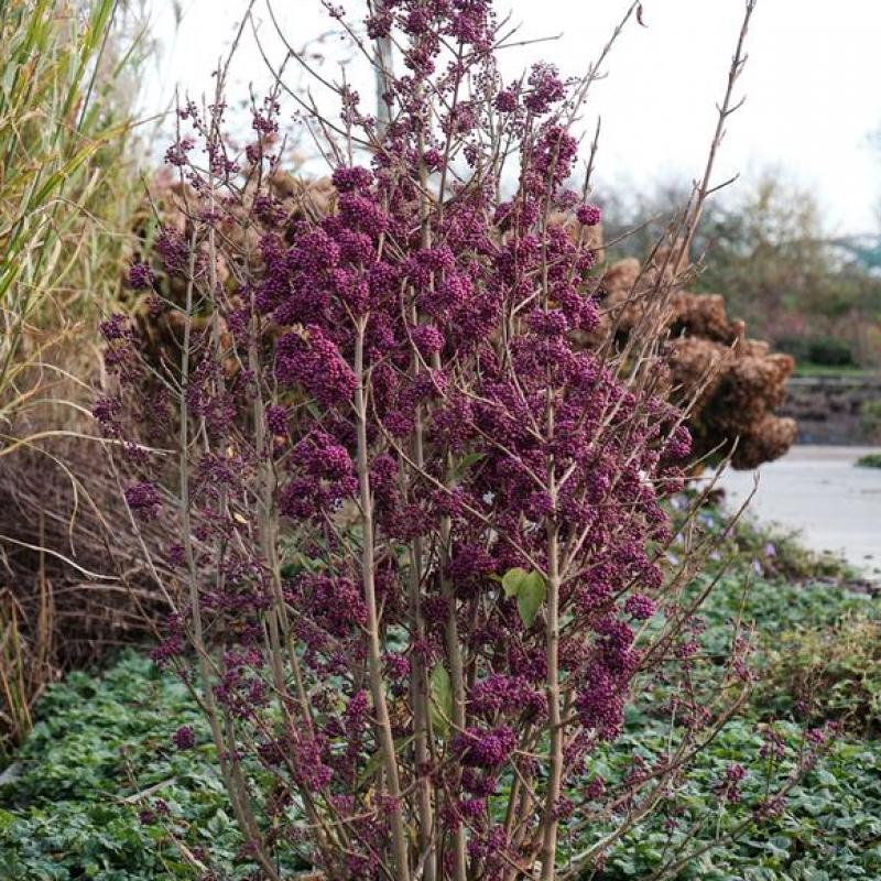 ‘Purple Giant’ makes a bold statement with its upright habit and massive clusters of rich violet berries that persist well into winter. This striking variety offers excellent fall and winter interest, while its summer flowers attract pollinators. Perfect for adding color and texture to mixed borders or naturalized settings.