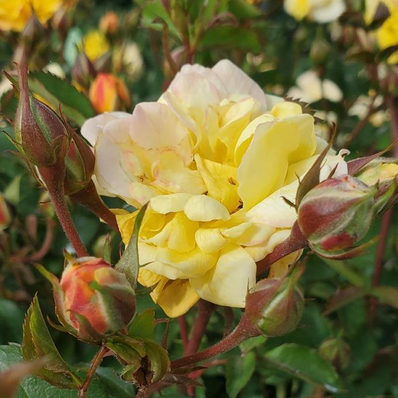 A vibrant, ever-changing rose that blooms in a mix of yellow, pink, apricot, and coral tones on the same plant. Exceptionally disease resistant and continuously flowering from late spring through frost.