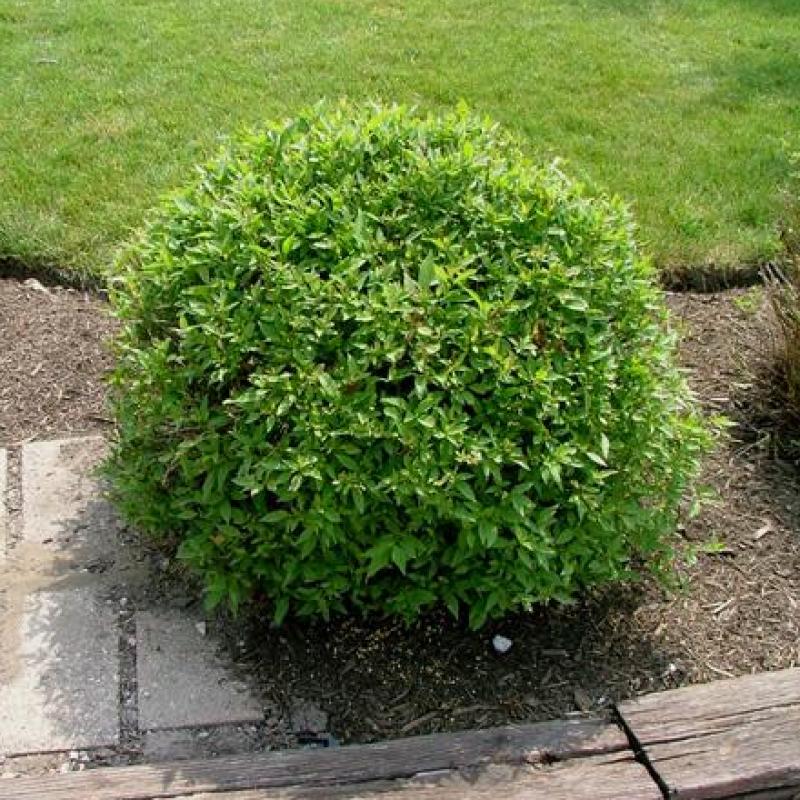 A dense and almost perfectly round plant, 'Huron' produces clusters of white flowers in early June that give way to white berries on red stalks. Light green foliage often tinged with red is shown off on gray stems, before turning purple in fall.