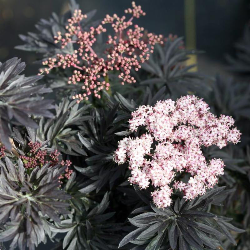 An elderberry like no other! Beautiful elderberries like Black Lace and Black Beauty have long been some of our most popular varieties - but as fairly large plants, not everyone has space for them. Enter Laced Up elderberry, an amazing narrow, upright variety that takes up only a few square feet of ground. Feathery black foliage covers broomstick-straight stems that shoot toward the sky but stay in a narrow column. Early summer brings hundreds of pink flowers to contrast with the leaves. It's an exotic looking plant that's surprisingly hardy and easy to grow!