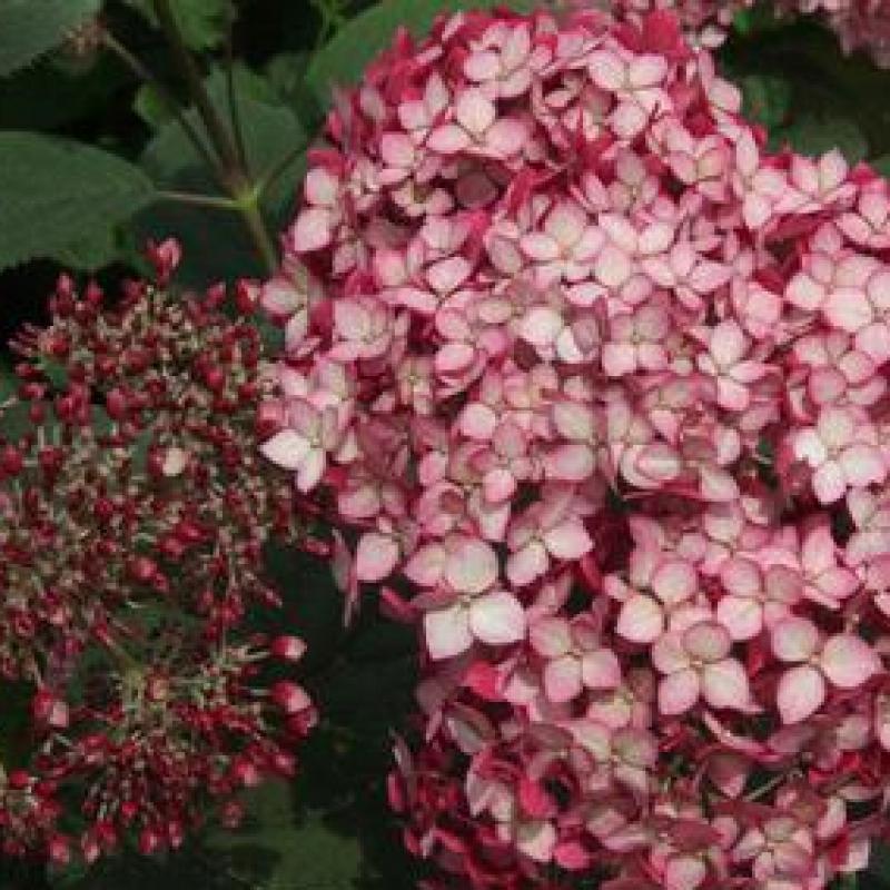This native hydrangea blooms on new growth. Its strong stems will hold deep burgundy-red flower buds which open to ruby-tinged flowers of silvery-pink. The blooms will age to soft green by September.