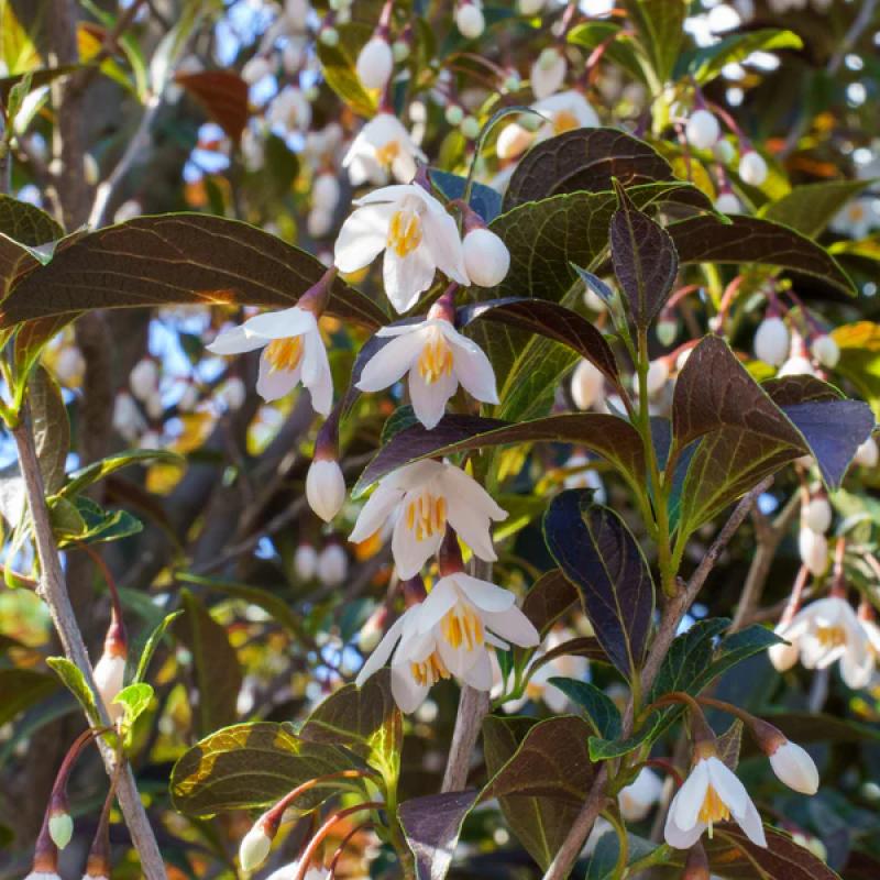 An elegant small tree showcasing dark purple foliage that contrasts beautifully with its dangling clusters of fragrant white, bell-shaped flowers in late spring. Compact and refined, it adds dramatic color and graceful texture to the landscape.