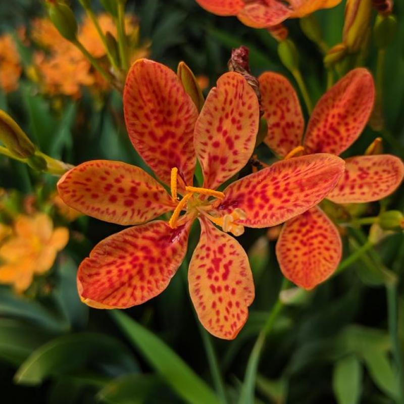 This selection's vibrant orange flowers feature red-speckled centers and appear in mid to late July atop architectural sword-like foliage. It also forms interesting green seed pods good for arranging or drying.
