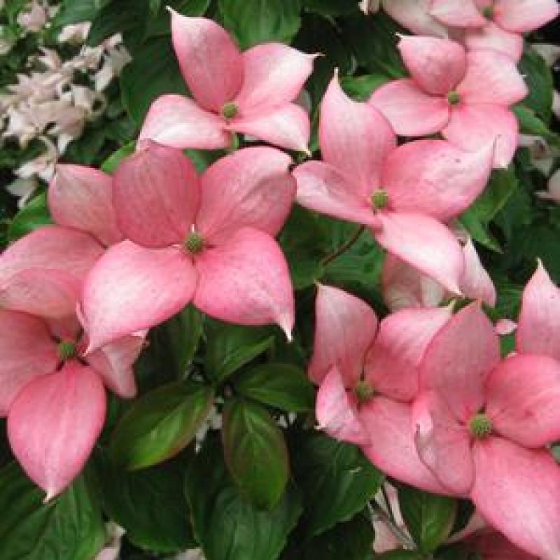 A distinctive Kousa dogwood with soft rosy-pink bracts that deepen in color as they mature. Blooms in early summer, followed by ornamental red fruit and attractive layered branching with good fall color.