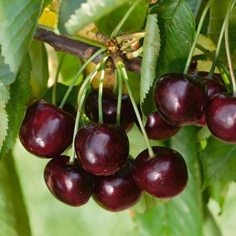 A late-season sweet cherry variety that produces large, firm, nearly black fruit with rich, sweet flavor. Excellent for fresh eating, baking, and preserves. White blossoms appear in spring, followed by a heavy summer harvest. A reliable, cold-hardy cultivar that performs well in northern orchards.