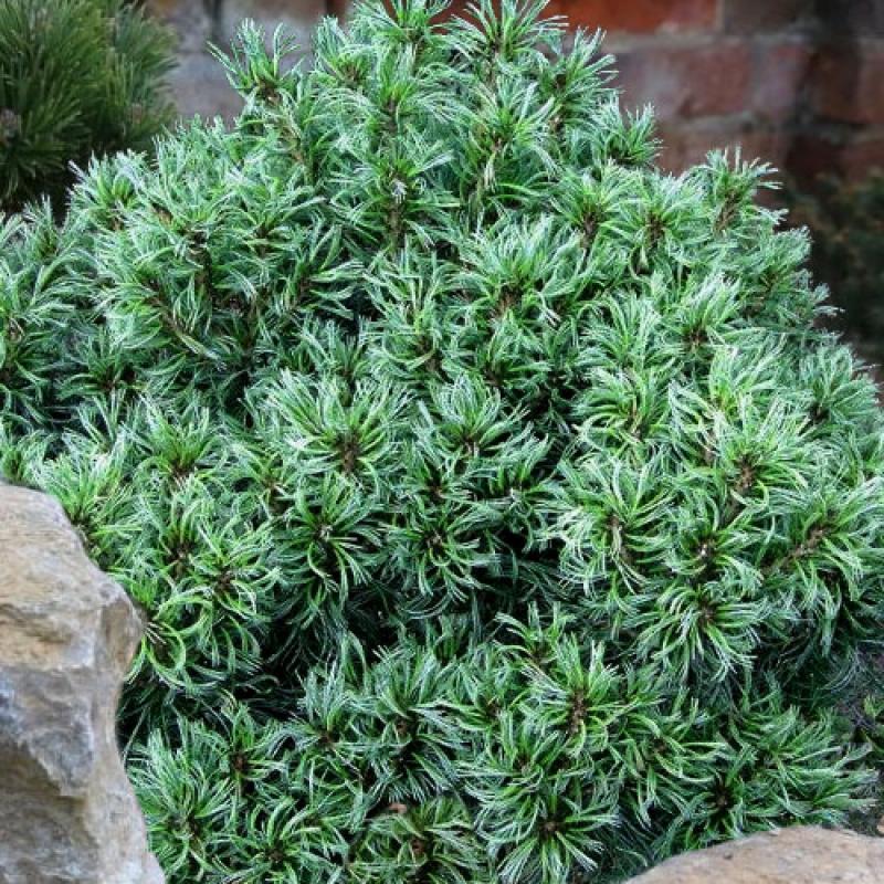 A compact, slow-growing dwarf white pine with distinctive short, twisted blue-green needles that give the plant a dense, textured appearance. Its naturally rounded habit makes it an excellent choice for rock gardens, foundation plantings, and small-space landscapes.