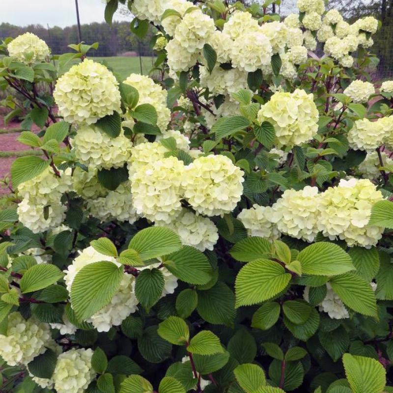 A show-stopping viburnum with large, rounded clusters of pure white flowers in late spring, resembling hydrangea blooms. Dark green foliage provides contrast and turns reddish-purple in fall. Excellent as a specimen or in mixed borders.