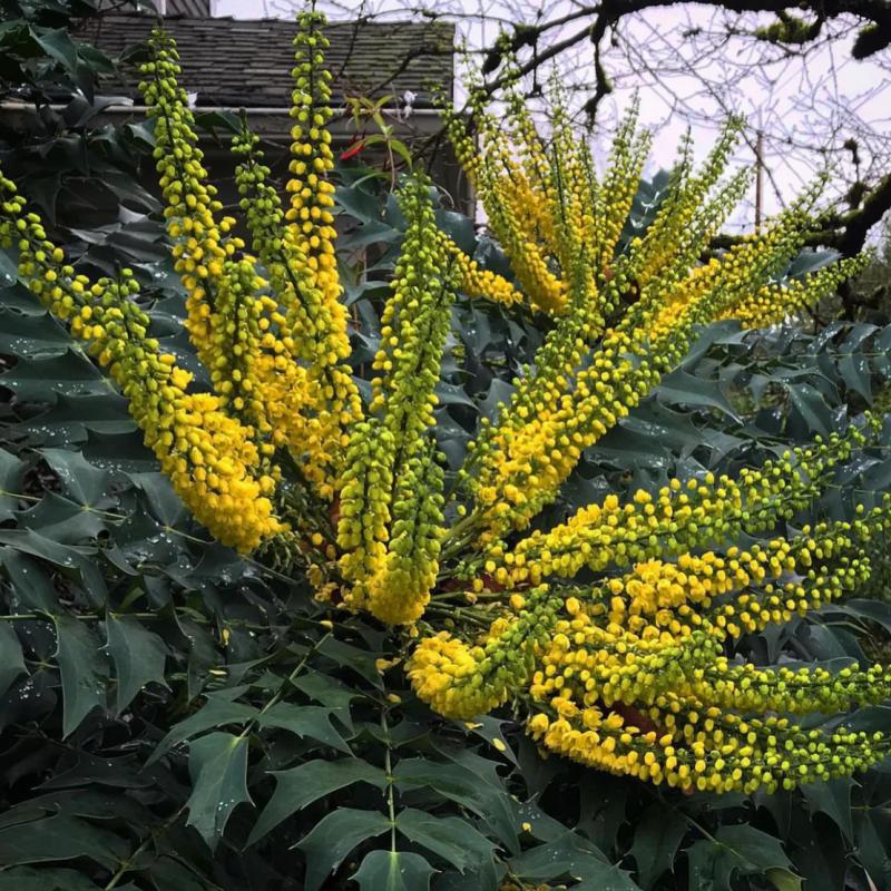 A striking early spring flowering shrub with dark evergreen foliage, the bronze new growth of 'Winter Sun' will contrast nicely with the mature dark green foliage. It also produces bright yellow flowers that are slightly fragrant and eggshell blue fruits.