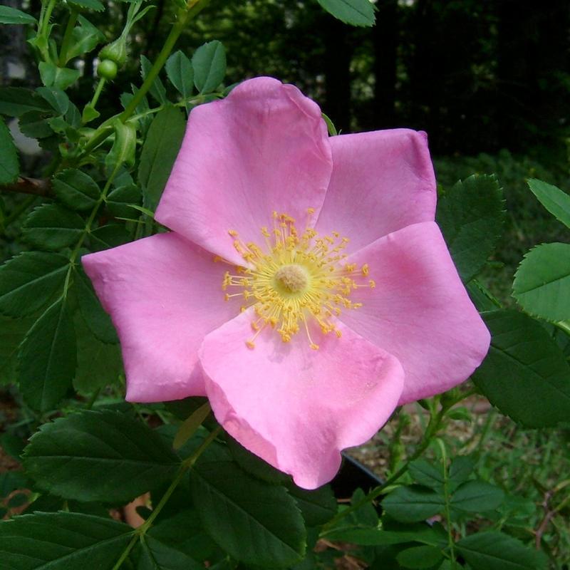This easy-care, naturalistic native produces slightly fragrant, single, light pink flowers with bright yellow centers, followed by splendid autumn colors. Plump red hips and reddish stems then last well into the winter.