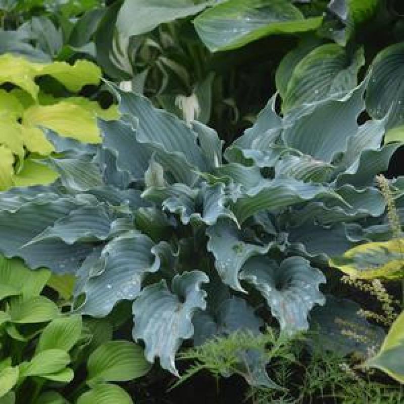 'Waterslide' has wavy, ruffled leaves with heavy substance. The leaves hold their blue color well into the summer season and lavender flowers will also appear in late summer.