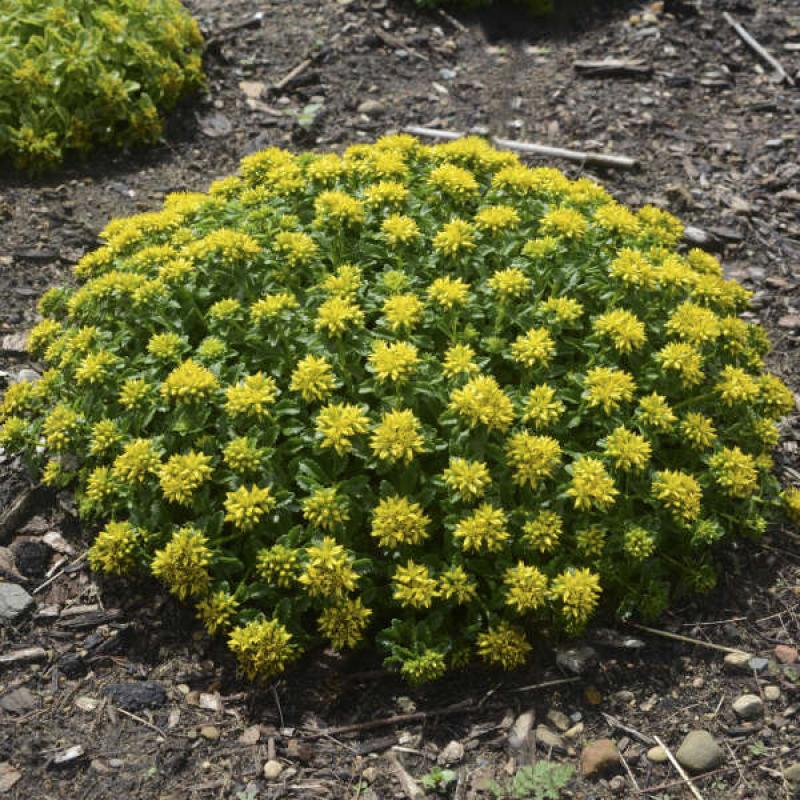 The serrated, deep green, shiny foliage of 'Little Miss Sunshine' surrounds the stem of this compact groundcover. In mid-June to July, plants are topped by cheery bright yellow flower clusters.