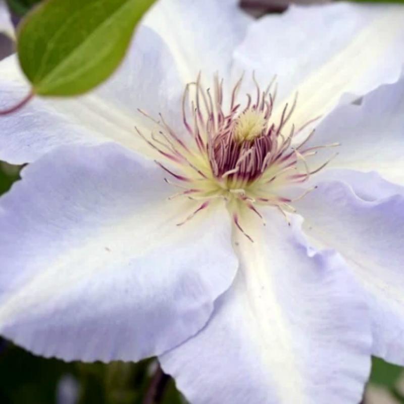 'Tranquilite' features light mauve flowers with white center petal shading and red-purple stamens. It will bloom from the bottom to the top, an improvement over other varieties, and heavily in June with repeating until September. (Pruning Group 3)
