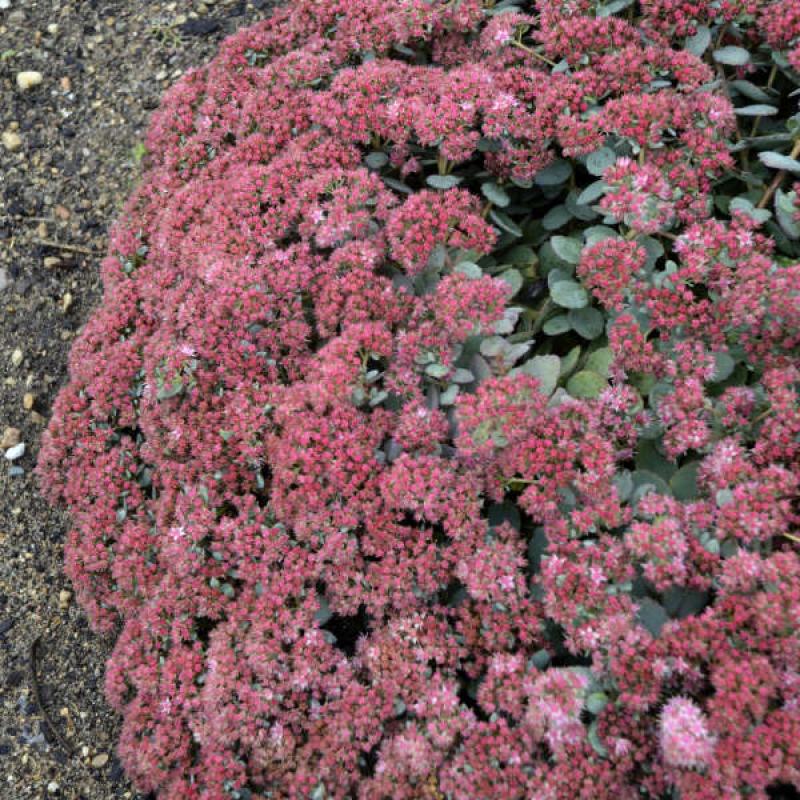 The succulent, blue-green foliage of 'Popstar' forms a mounding habit that will be covered in masses of mauve-pink flowers in late summer.