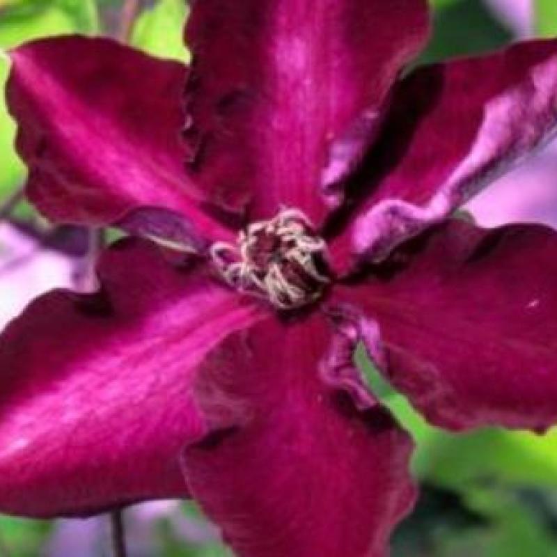 'Amethyst Beauty' features velvety, deep amethyst purple flowers that mature to purple-blue and will bloom from the bottom to the top, an improvement over other varieties. It blooms heavily in June with repeating until September. (Pruning Group 3)