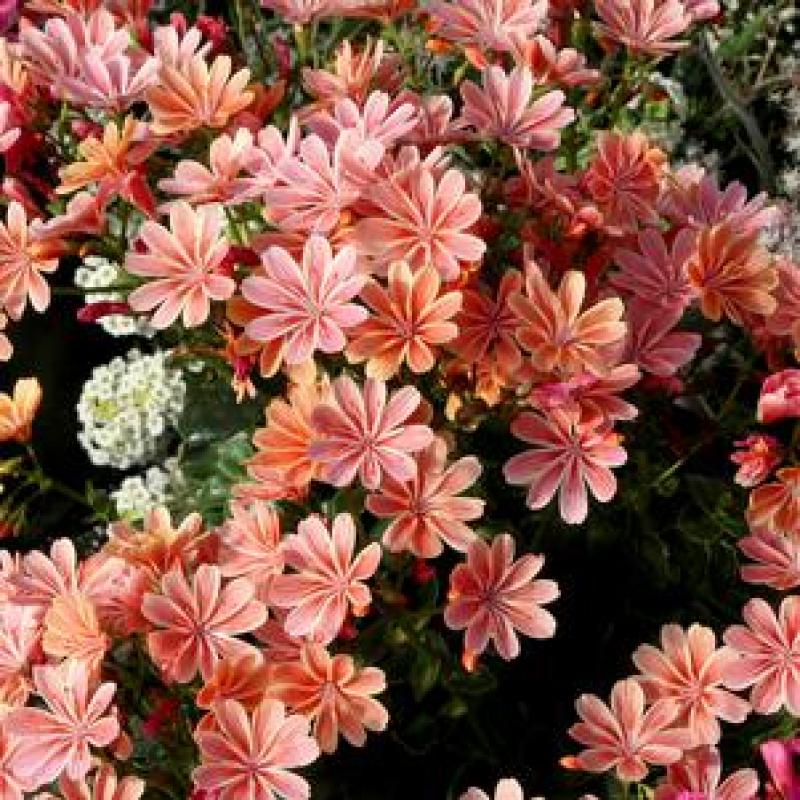 This Lewisia displays stunning large coral-pink flowers with creamy white petal edges from late spring to fall amid a low rosette of leathery evergreen leaves. 'Constant Coral' is a drought tolerant selection.