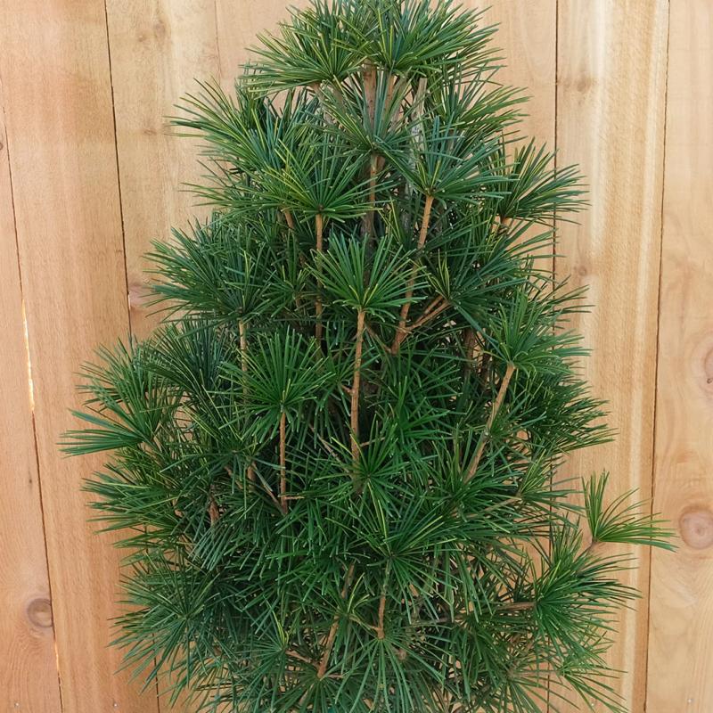 A striking, narrow evergreen with dense, glossy, umbrella-like needles arranged in distinctive whorls. Naturally columnar and slow growing, it offers a bold architectural accent for modern or traditional landscapes. Provides year-round texture and rich green color.
