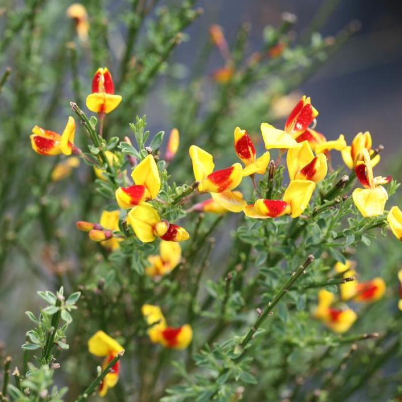 A compact, spring-blooming shrub with vivid yellow flowers accented by deep red markings. ‘Sister Disco’ brings bold color to sunny landscapes and thrives in lean soils with minimal care.