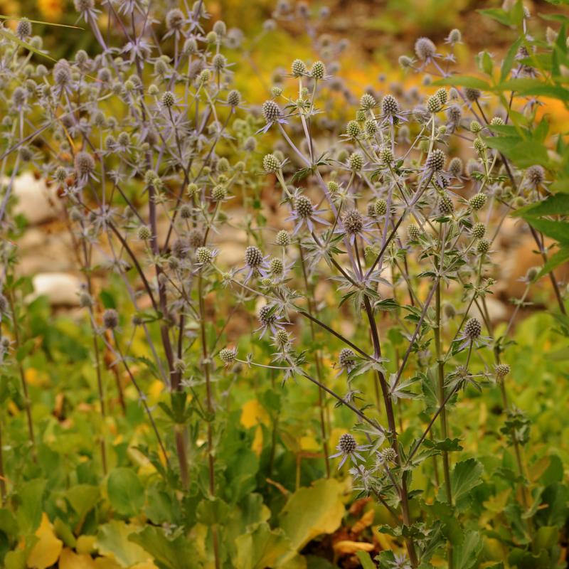 An exceptionally floriferous and compact variety that blooms for a long period in midsummer, 'Blue Glitter' features glowing, steely-blue pincushion flowers surrounded by equally unusual colored bracts that arise from thistle-like gray-green foliage.
