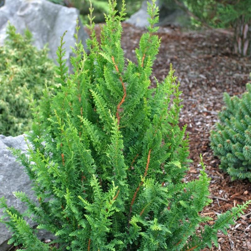 This variety offers green, fern-like foliage on an upright, compact and pyramidal plant that makes for a wonderful textural element in the landscape. Pruning will promote an even more compact shape.