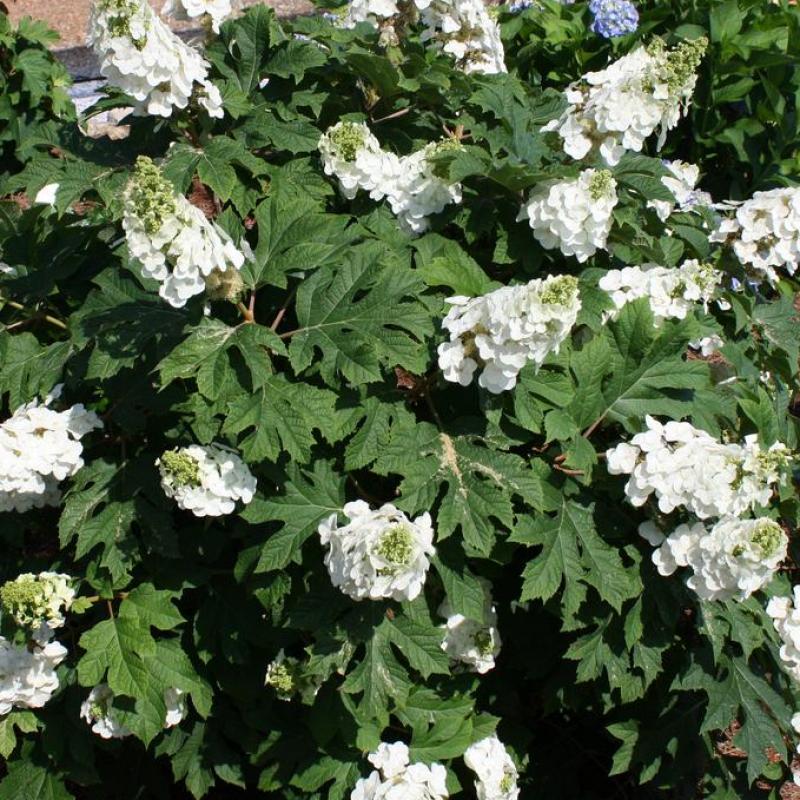 A quantum leap in oakleaf hydrangea introductions with dense compact non-flopping habit. The lustrous dark green foliage is resistant to leaf spot and turns a fantastic orange-red in autumn. Flowers held high on strong stems are a beautiful white aging to pink. Classic native flowering shrub for the garden, grouping and massing. Peeling rich tawny-brown bark adds winter interest.