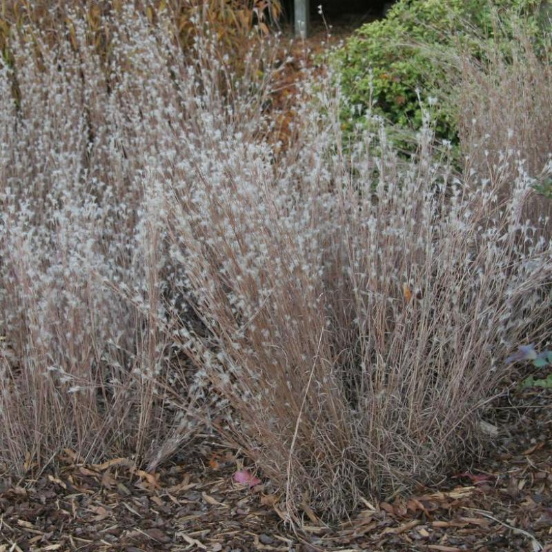 A compact selection of Splitbeard Bluestem with silvery seed heads that shimmer above fine-textured blue-green foliage, maturing to coppery tones in fall. Adds striking texture and movement to native or naturalized gardens.