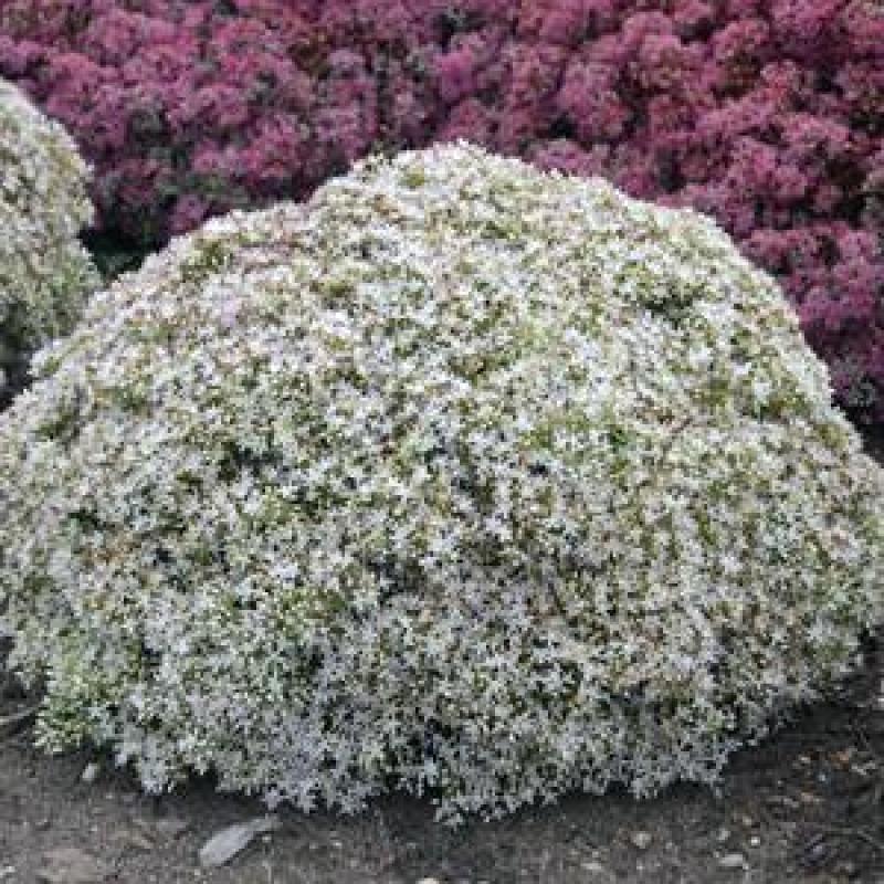 'Bundle of Joy' is a white flowering sport of 'Pure Joy'. It has masses of sweet white flowers that smother the dome-like plant in late summer and will be highly attractive to bees and butterflies. It is also drought and salt tolerant.