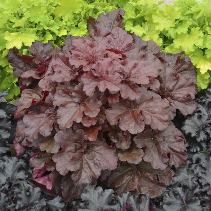 One of the largest heucheras available, forming bold mounds of glossy mahogany-red foliage with ruffled edges. Sprays of tiny white flowers appear in midsummer. A striking foliage plant for borders, mass plantings, or containers, offering season-long color and texture.