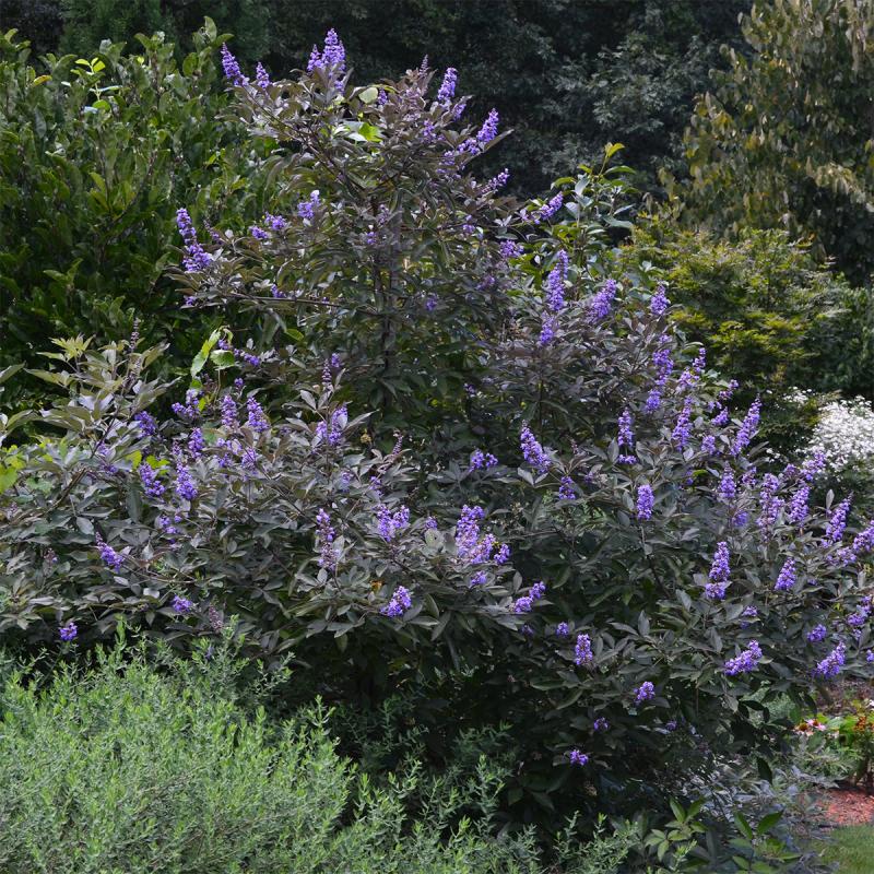 A striking vitex with deep purple foliage on top and silvery undersides that shimmer in the breeze. Spikes of rich lavender flowers appear in summer and attract pollinators. A bold, colorful shrub that thrives in heat and sun.