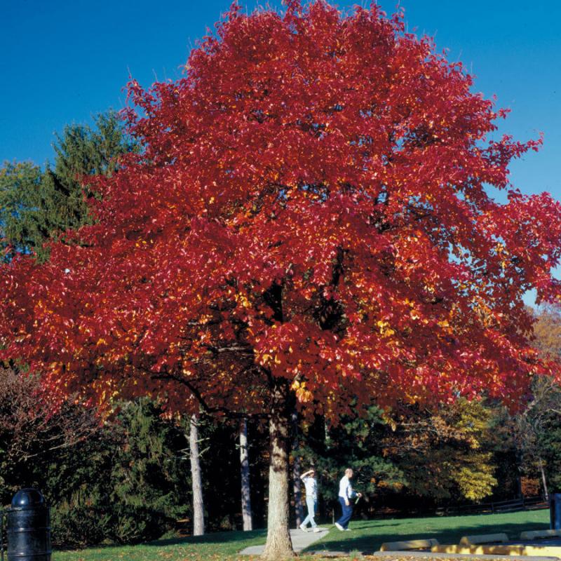 The glossy new leaves of 'Wildfire' are tinged burgundy red in spring, mature to equally glossy green, and then transform again in fall to intense red shades. It will take on a neat, wide, pyramidal form.