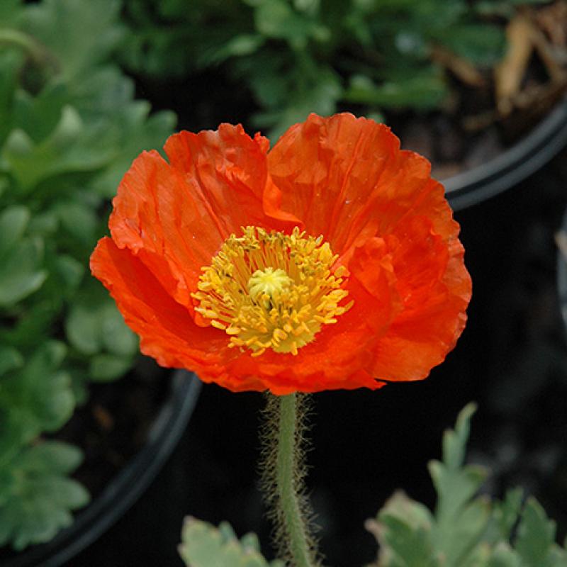 Brilliant orange, crepe-like petals with sunny yellow centers rise on wiry stems above low clumps of fuzzy foliage. Blooms in cool weather, making it perfect for spring borders, containers, or alpine gardens.